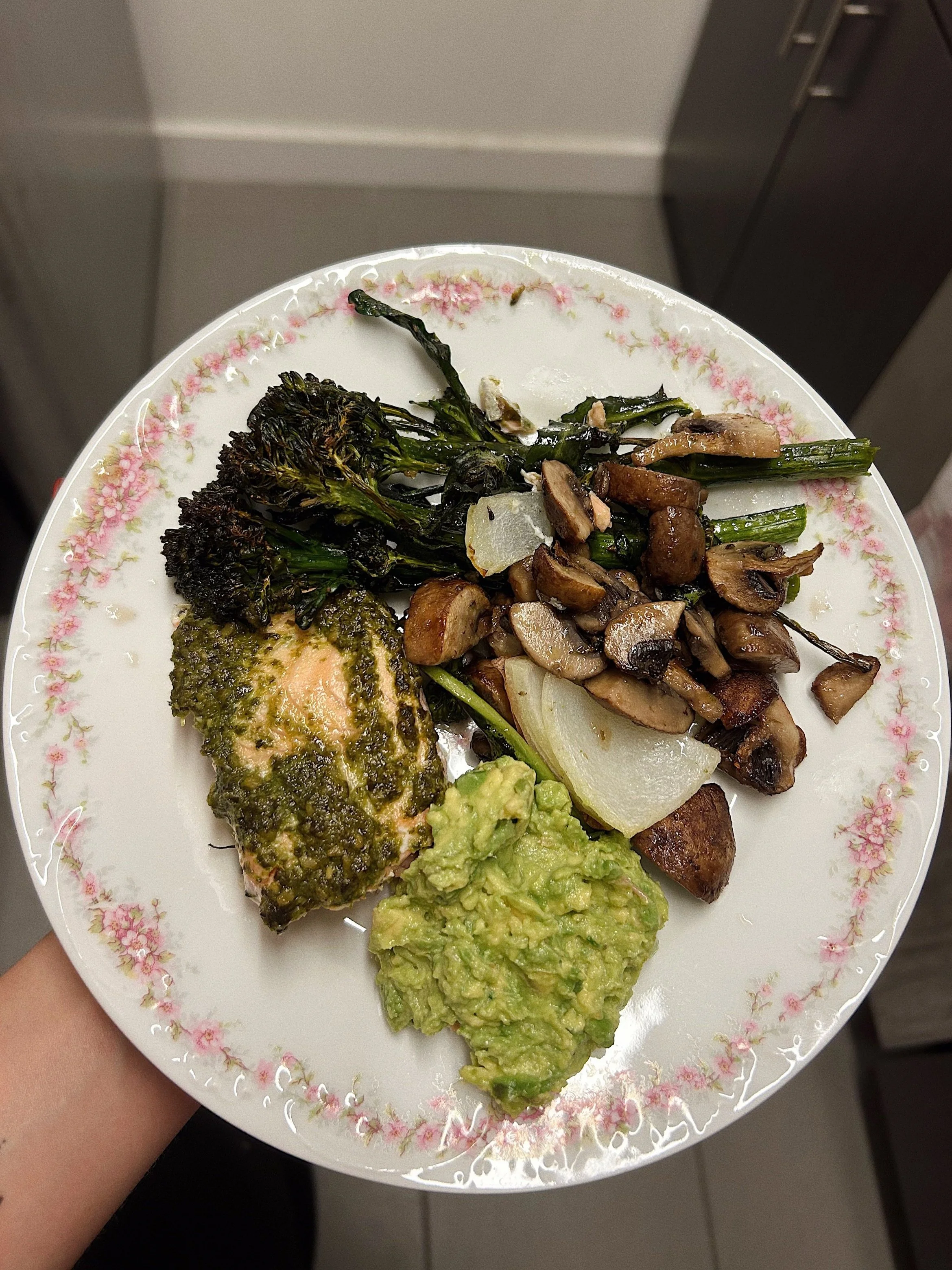 Pesto Salmon with Roasted Broccolini + Mushrooms