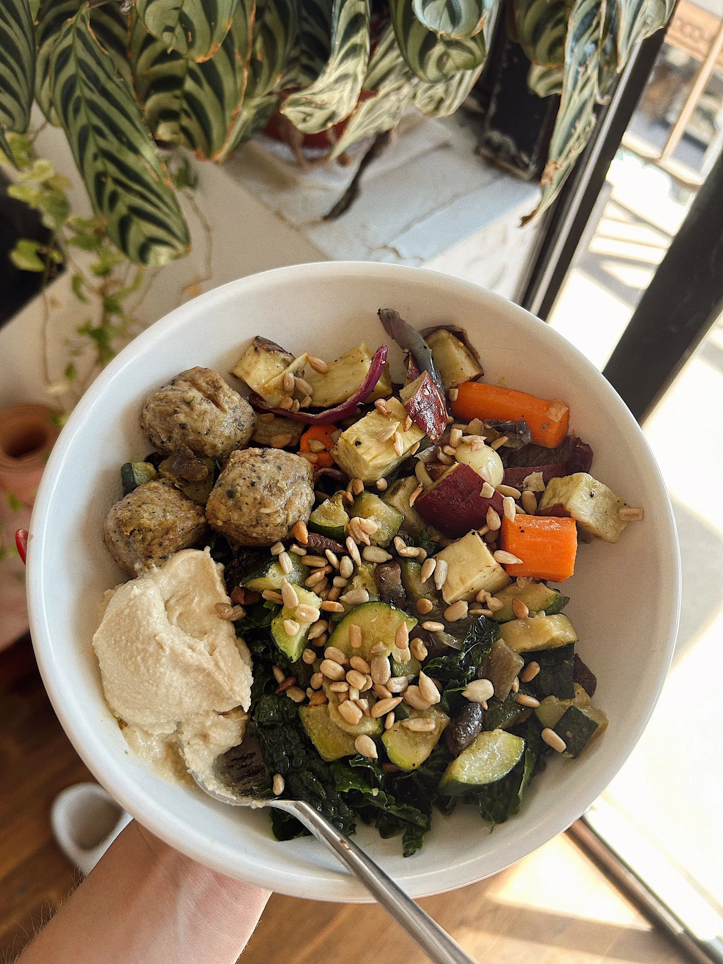 Greek Turkey Meatball Bowls with Roasted Veggies & Hummus