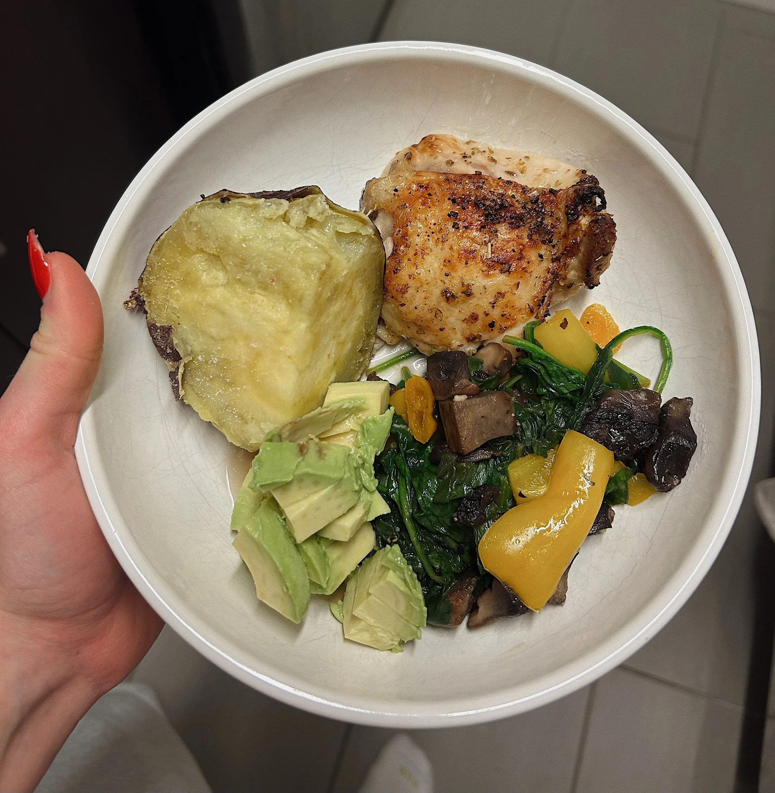 Crispy Garlic Chicken Thighs with Japanese Sweet Potato + Veg
